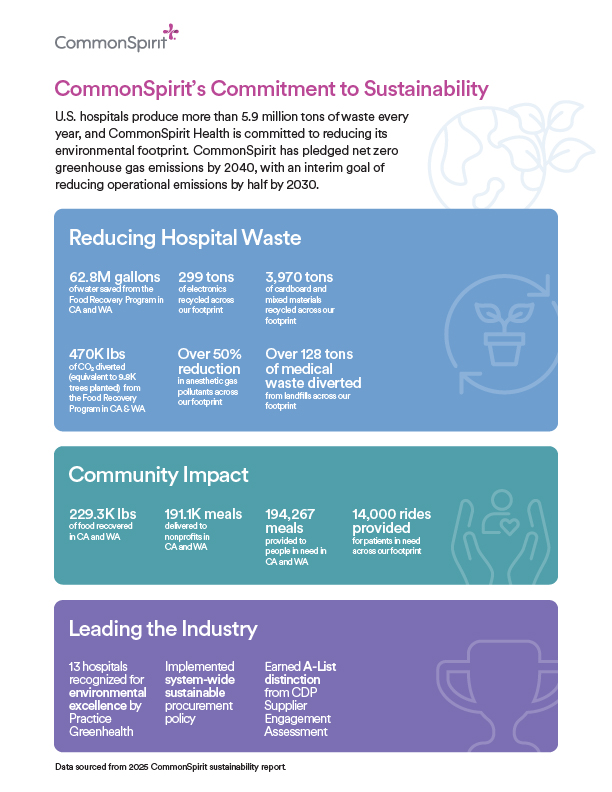 U.S. hospitals collectively produce over 5.9 million tons of waste annually, and CommonSpirit Health is committed to reducing its environmental footprint. CommonSpirit has pledged net-zero greenhouse gas emissions by 2040, with an interim goal of a 50% reduction in operational greenhouse gas emissions by 2030.